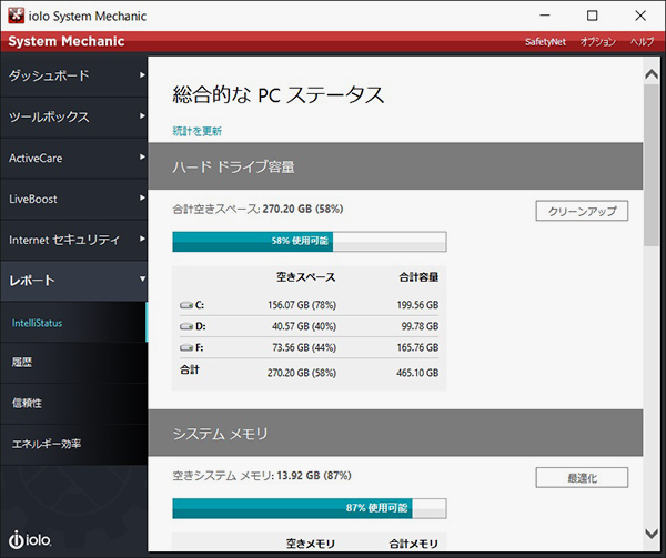 本ソフトは、パソコンの問題を自動的に洗い出し、1クリックで簡単にメンテナンスができる。特許技術「ActiveCare」を搭載しており、パソコンを使用していないときにだけ自動的にシステムをメンテナンスして快適な状態を保つことが可能だ。