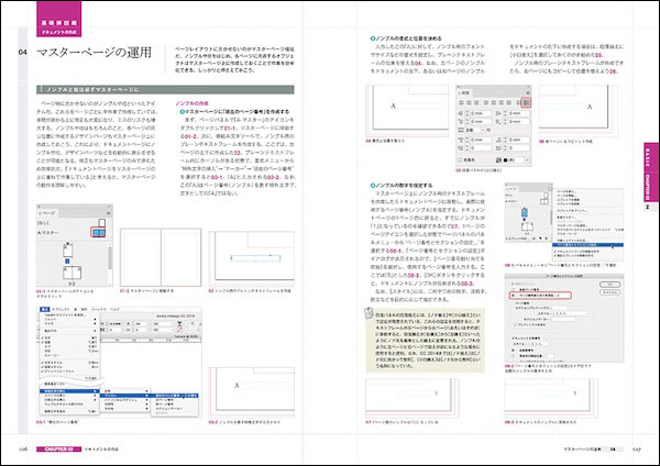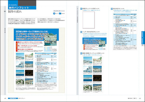 第2部「ケーススタディ」では、実際に印刷物を制作する上での手順を、いくつかの制作物を基に解説していく。「文芸書」のシンプルな紙面の組版、ビジュアル重視の「雑誌(見開き)」ページ、膨大な量の繰り返し要素を扱う「カタログ」ページ、情報量の多い要素をレイアウトする「旅行パンフレット」、「特色2色の印刷物」の、5つの作例の具体的な作成手順を紹介。初心者はもちろん、仕事でInDesignを使っている人にも、非常に役立つ内容が詰まった一冊となっている。