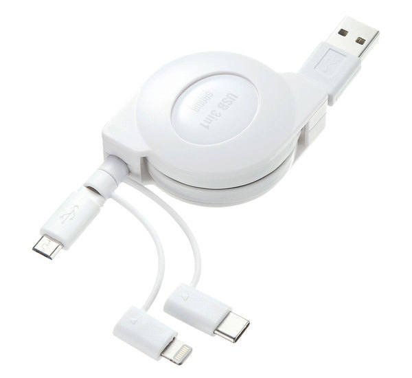 サンワ、Lightningなど複数のコネクタに1台で対応する巻き取りケーブル「KB-IPLTM12W」を発売