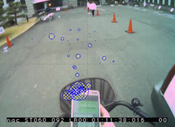 また、実際にスマートフォンのメッセージ画面を操作しながら自転車を走行させる「ながら運転」の実証実験を実施。実験から自転車ながらスマホ走行時の視線を分析すると、歩行者の見落とし率は5割増になり、歩行者を認識するまでの時間は1.7倍になり、歩行者を注視する時間は通常時に比べて「23%」に減少するという結果が得られた。