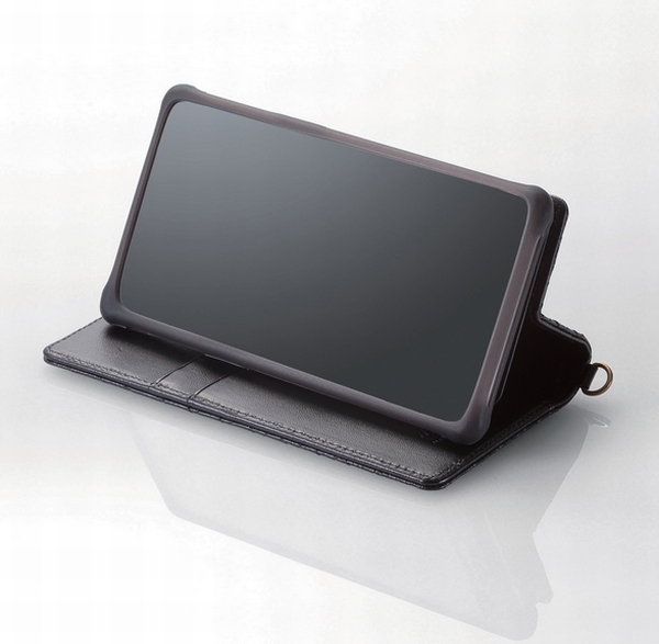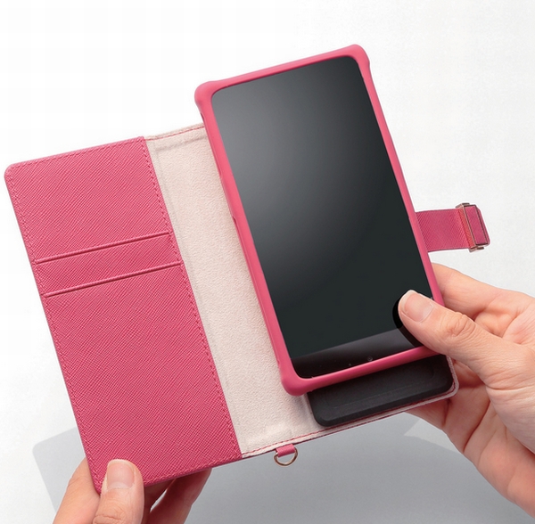 ソフトレザー製は3タイプを用意。ケースに入れたままでも、スマートフォンを上部にスライドさせればスマホのアウトカメラ(メインカメラ)を露出させることができ、撮影も可能。また、スタンドにして動画視聴したり、ICカードなどを収納するポケットも備える。