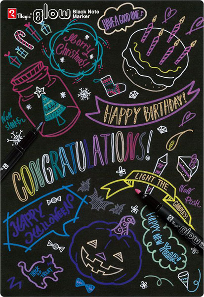 寺西化学工業、黒紙に描いてしばらく経つと色が浮き出る水性顔料マーカー「マジック グロー」