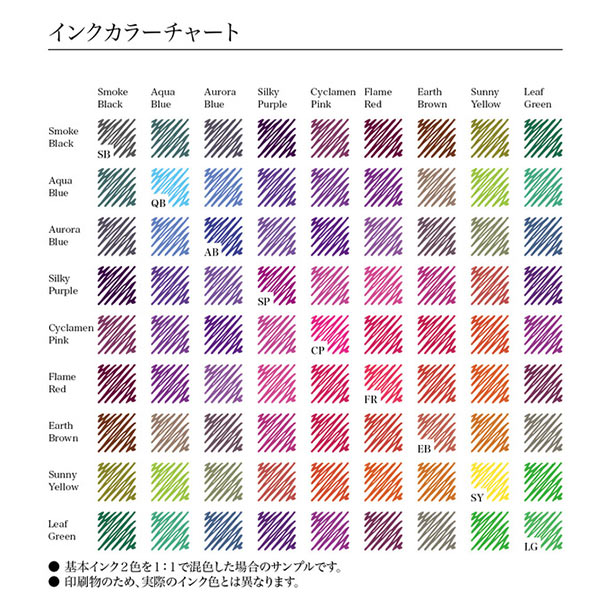 本商品では、全9色のインクを自由に混ぜ合わせ、自分の好みの色に調合して使える。混ぜ合わせずにそのまま使用しても発色が良く、美しく個性的なインク色を楽しむことが可能だ。水性染料インクで、インク組成は従来の「ミクサブルインク」60mlと同等。別売の「インク調合キット」の専用うすめ液を用いることで、インクの濃さの調整もできる。