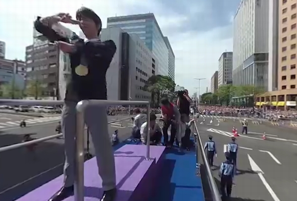 動画はわずか1分50秒だが、沿道に向かってただ手を振るだけではなく、メダルを掲げてみたり、ポーズをとってみたりと、金メダルを取った羽生選手の「魅せる」演技の一端を垣間見ることができる。