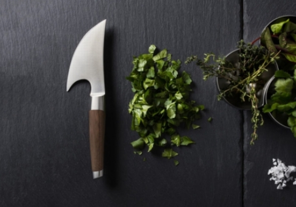 サビに強く切れ味が鋭いモリブデンバナジウム鋼と人間工学に基づいたデザインで、持ち手のウォールナットが高級感を醸す。職人の手によって生み出されるナイフは、刃物が持つ危うさとデザインとしての美しさが同居している。