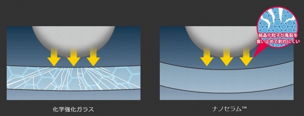 ナノセラムは、ナノ結晶化技術によって製造された素材。従来の化学強化ガラスと比較して、鉄球落下試験で3倍以上の強度を備え、硬度も約20%向上と、耐衝撃性と硬度が求められるスマホの保護ガラスにうってつけの素材。