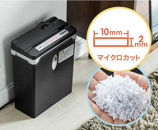 同製品は、コンパクトサイズのマイクロカット電動シュレッダー。ホチキスの細断に対応しており、10号針、11号針を付けたまま最大3枚まで同時に細断できる。細断形状は2×10mmのマイクロカットで、プラスチック製や紙製のカードの細断にも対応している。