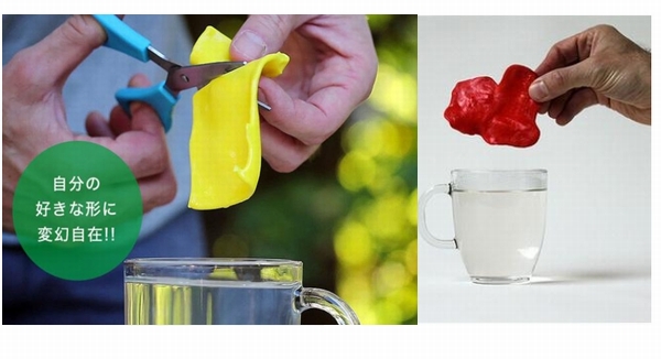 1枚は幅8.5×縦5.5×0.3 cmの手のひらサイズで、これをお湯の中に入れると手でぐにゃぐにゃと整形したり、はさみで切ったりと自由に形を変えられる。