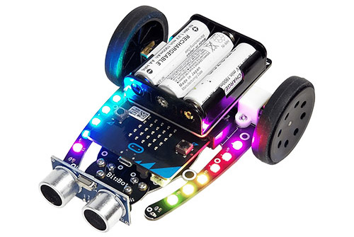 同製品は、教育用マイコンボードとロボットカーキットを使って、オリジナルの付属ガイドブックを参考に組立工作を楽しめるキット。付属の教育用マイコンボード「BBC micro:bit」は、ブラウザ上でブロックを組み合わせてプログラミングが可能で、単体でも入門用プログラミング教材として楽しめる。