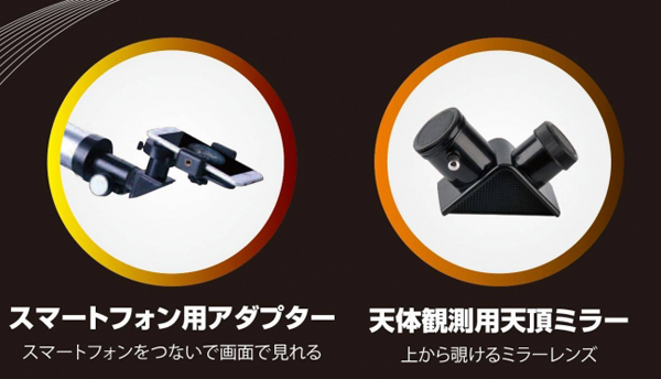 接眼レンズを取り付ける天頂ミラーにスマートフォンをセットするためのアダプターが取り付け可能で、スマートフォンで映像を保存できる。スマートフォンのディスプレイ部に映し出すことで、目的物の捕捉が容易になり、複数人での観測も可能となる。
