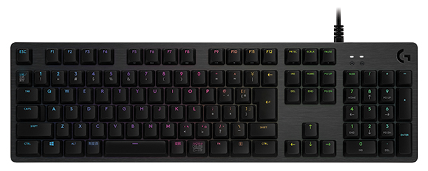 USB 2.0接続式の有線ゲーミングキーボード「G512」では、これまでに「リニア」と「タクタイル」がラインナップされていた。いずれもキーストロークが3.2mm(接点1.5mm)で、押下圧が45g。「タクタイル」は従来的な「Romer-G」特有のクリック感と軽さがあり、「リニア」はキータッチが非常に柔らかいモデルだ。