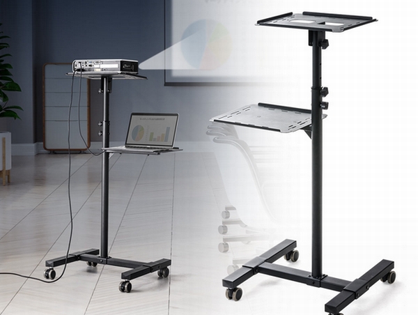 本製品は、デバイスを置く台を2つ搭載したスタンド。映像を投影するプロジェクター用に開発されたもので、プロジェクターをトップに置き、映像・写真データを出力するノートパソコンなどを下部の台に置いて使う。