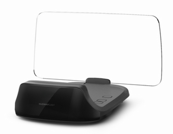 本製品は、スマートフォンの画面をワイヤレスで投影できるヘッドアップディスプレイ。車のダッシュボードに映像投影用のデバイスを設置して、運転しながらナビなどの映像を見ることができる。