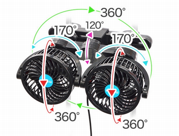 ファンの角度調節は上下360°、左右約170度回転し、1台づつ向きを変えることもできる。ファンを運転席の方向に向けて、ドライバーの首筋を冷やすこともできる。