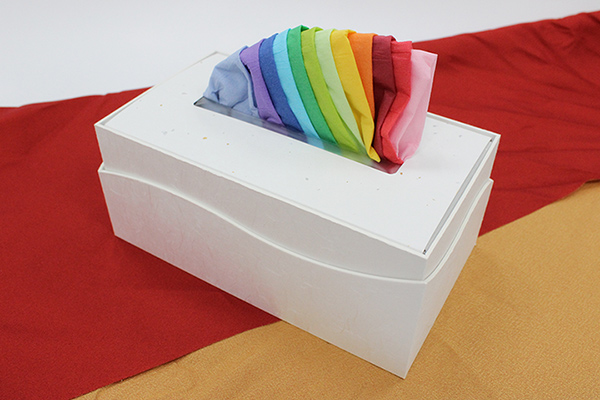 大昭和紙工産業株式会社は、カラーティッシュ「十二単ティッシュ」の新ラインナップとして、「新十二単ティッシュ」の限定販売を開始した。価格は9260円(税抜)で、本記事の執筆時点で残り数わずか。従来の「十二単ティッシュ」と同様に、日本の伝統色をイメージした12色(桜色 / 緋色 / 蘇芳色 / 橘色 / 菜の花色 / 若緑色 / 苗色 / 常盤緑色 / わすれな草色 / 瑠璃色 / 桔梗色 / 藤色)で配色されている。