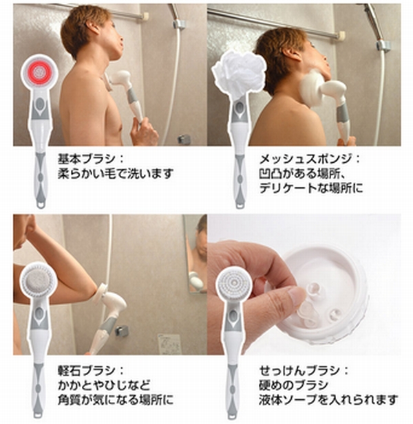 ブラシの種類は4つ。柔らかい毛で洗う「基本ブラシ」、凸凹がある場所やデリケートな場所を優しく洗う「メッシュスポンジ」、かかとやひじなど角質が気になる場所に使える「軽石ブラシ」、液体ソープを入れて使える「せっけんブラシ」となっている。