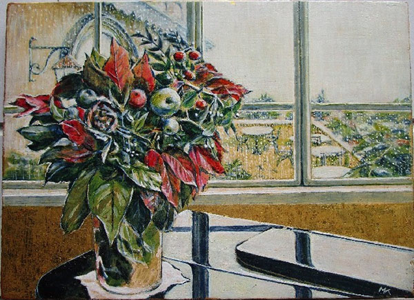 西洋で広く用いられてきた中世以来の卵黄テンペラ技法は、石膏下地の画面に金箔を貼り、卵黄を練り合わせて作った絵具で描くもの。特に細密な風景画などを描くのに適した技法で、輝きのある明るい色彩と経年変化しにくい特徴を併せ持つ。