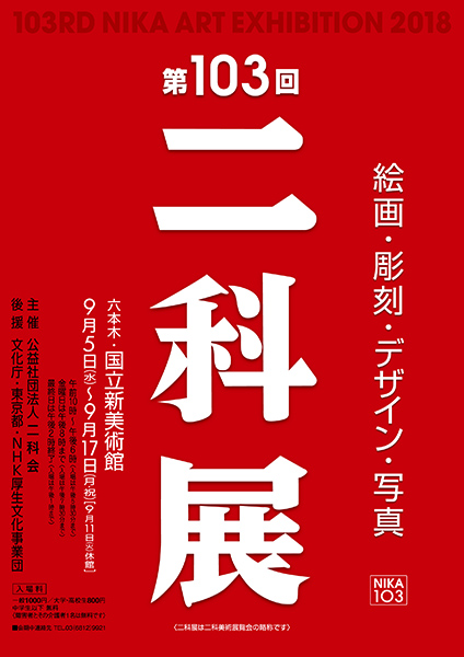 2018年9月5日(水)から9月17日(火)まで、国立新美術館にて「第103回 二科展」が開催される。公益社団法人二科会が主催する恒例の公募展で、文化庁 / 東京都 / NHK厚生文化事業団が後援。東京での会期終了後には、京都 / 大阪 / 広島 / 鹿児島 / 福岡の各都市での巡回展も予定されている。休館日は9月11日(火)で、当日券での入場料は一般1000円 / 高校・大学生800円 / 中学生以下無料。