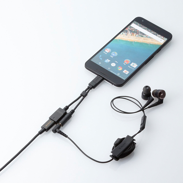 本製品を使用すると、スマートフォンやタブレットなどの3.5mmステレオミニ端子が廃止されたモデルでも、3.5mmステレオミニプラグを備えた手持ちのイヤホンやヘッドホンを使える。2股に分岐された変換アダプタで、最大5V / 500mA出力の充電用USB端子も追加されるため、音楽を聴きながら充電が可能だ。