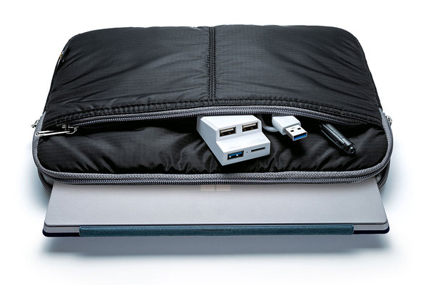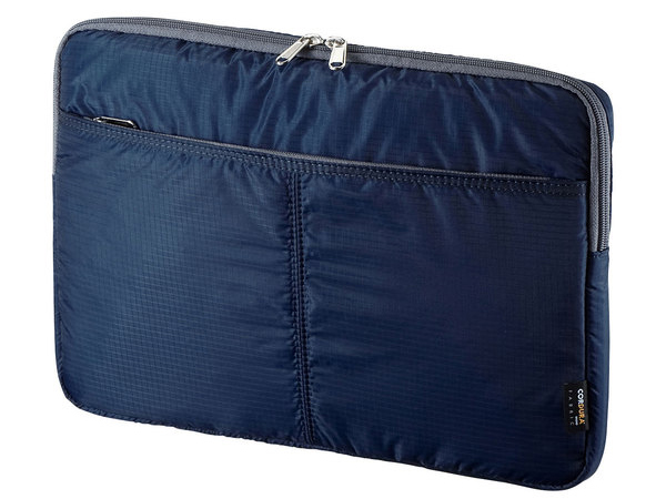 しなやかで滑らかな表面で、鞄への出し入れもスムーズ。収納式ハンドルが用意されており、単体でビジネスバッグとしても使える。そのほか、電源アダプタやメモリーカードなどを一緒に収納できるファスナーポケットも用意された。外寸は285(幅)×210(高さ)×20(奥行)mm、内寸(参考収納寸法)は260(幅)×190(高さ)×18(奥行)mmで、重量は122g。
