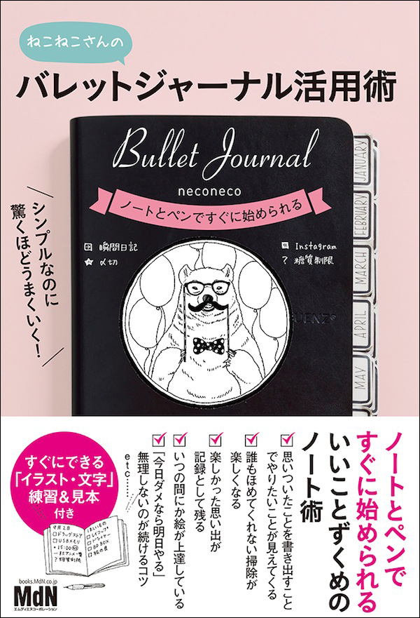 本書では、人気の手帳術・バレットジャーナルを活用しているねこねこさん(@88necoco)が、スケジュール管理、TODO管理はもちろん、ダイエットノート、買い物リスト、アイディアメモ、未来ログなど、さまざまな用途に使えるバレットジャーナルの作り方を伝授してくれる。バレットジャーナルの基本から活用メソッドを解説し、後半ではイラストが描けない人でもすぐに使える練習ページを用意。バレットジャーナルに使えるイラストや文字の描き方などを覚えられる。