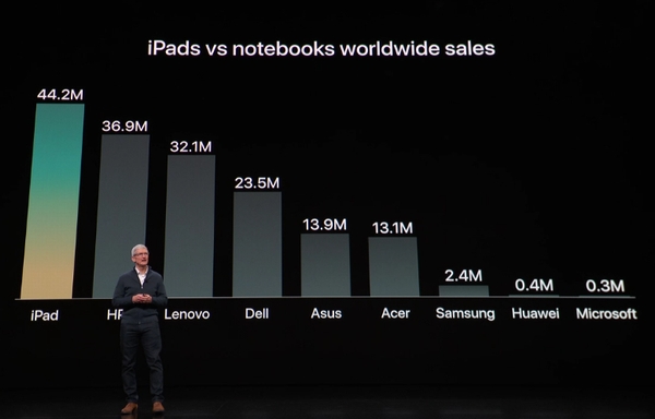 「MacBook Air」「Mac mini」に続いて発表されたプロダクトは「iPad Pro」だった。まず、ティム・クックCEOは他社のノートパソコンと比べ、「iPad」が一番売れているコンピューターであると強調した。