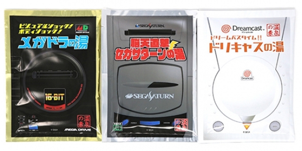 本商品は、“ビジュアルショック!”な「メガドラの湯」、“脳天直撃!”な「セガサターンの湯」、“ドリームバスタイム!”な「ドリキャスの湯」のセット。「メガドラの湯」のモチーフとなった「メガドライブ」は1988年に発売された16ビットCPU搭載機、「セガサターンの湯」のモチーフとなった「セガサターン」は1994年発売の32ビットマルチメディアマシン、「ドリキャスの湯」のモチーフとなった「ドリームキャスト」は1998年に発売されたセガ最後の家庭用ゲーム機で、ネットワーク機能を標準搭載したマシンだ。