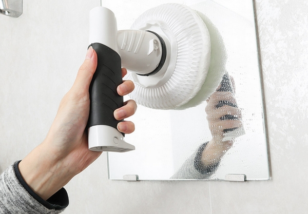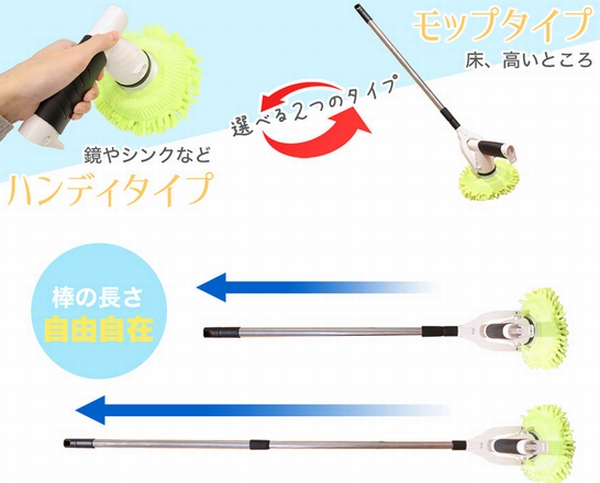 バーを取り外して回転モップを直接操作するハンディタイプにすることも可能。洗面台の鏡を掃除したり、キッチンのシンクを掃除したりといろいろな使い方ができる。
