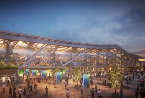 すでに駅舎のデザインは隈研吾氏が担当し、膜構造の大屋根や鉄骨と木の集成材でフレームを組み上げる独特なスタイルが発表されている。