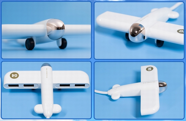 本製品は飛行機の形をしたUSBハブ。両翼に2ポートずつを搭載し、合計で4つのUSBポートを増設できる。