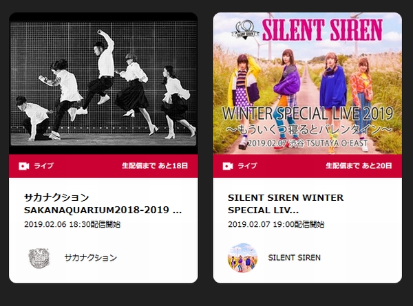 有料コンテンツの第一弾は2月6日18時30分配信開始の「サカナクション SAKANAQUARIUM2018-2019 “魚図鑑ゼミナール”」1080円、2月7日19時配信開始の「SILENT SIREN WINTER SPECIAL LIVE 2019 〜もういくつ寝るとバレンタイン〜」2160円の2本となっている。