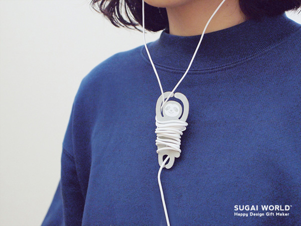 本製品を使用するとイヤホンケーブルを好きな長さに調節することが可能。一見すると、動物が腕を上げているだけの形に見えるが、“足”の間にケーブルのプラグを入れて、“体”にクルクルとケーブルを巻き、“腕”の間にケーブルの端をとめることで、簡単にケーブルを束ねられる。フックなどに“足”を引っ掛けて、ぶら下げて収納することも可能だ。