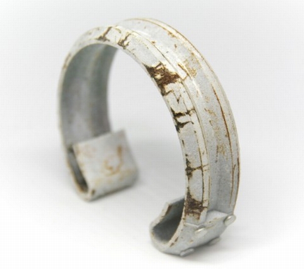 本製品は「古びた未来、作ります」のコンセプトで作品作りするForLorNの作品。「ガードレールバングル(錆)」は、ガードレールをくるっと丸め、長期間野晒しにして錆びさせたデザインだ。道路の隅で交通安全のために設置されながらも忘れ去られたかのような退廃美。シンプルながら妙な存在感のあるアイテムに仕上がっている。サイズは内径56㎜で、基本レディース用(細めの男性でも可)。