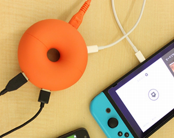 本製品は、「雑貨屋さんに置いてほしい!」という想いで開発された電源タップ。見た目はまんまるのドーナツで、スマホなどを充電するためのUSBポートを2口と、Nintendo Switchなどに使えるType-Cポートを1口搭載する。