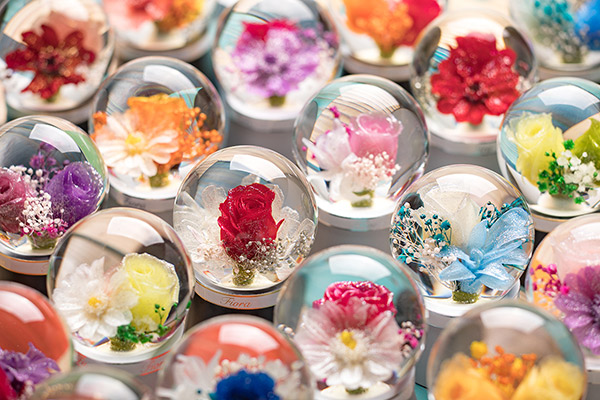 本商品は、球体ガラス内にプリザーブドフラワーが閉じ込められており、プレミアムなギフトとしても適したアイテムだ。全て生花を使用し、1つずつハンドメイドで丁寧に製造。プリザーブドフラワーの美しさを増幅して、持続させるため、特殊なオイルが使用されている。オイル自体の屈折率がガラスと非常に似ているため、オイルとガラスが一体化したように透明度が増加しており、花を明るく照らし出す仕組み。球体ガラス内に取り込んだ光を繰り返し反射させる全反射を利用して、ガラス内に色鮮やかな花の世界が作り出されている。
