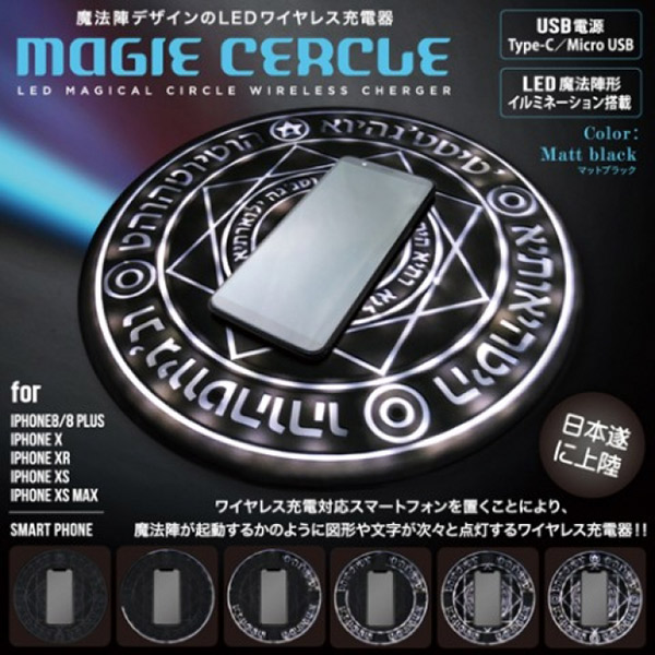 株式会社Village Vanguard Webbedは、“魔法陣ワイヤレス充電器”として話題になった「マジーセルクル」の取り扱いを開始した。ワイヤレス充電に対応するスマートフォンを置いて充電できるが、その際に魔法陣が起動するかのように、図形や文字が徐々に点灯していく仕掛け。iPhone 8/8Plus、iPhone X、iPhone XR、iPhone XS、iPhone XS MAXに対応している。価格は7538円(2019年3月8日時点での税込価格)で、4月中旬〜下旬の発送が予定されている。