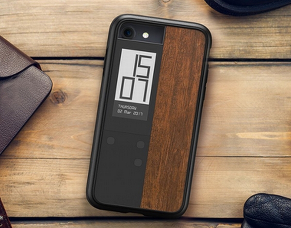「InkCase IVY for iPhone 7/8 ケース」は背面にセカンドスクリーンを搭載したケース。縦長の小さなディスプレイには、iPhoneと同期した時計・日時・リマインダー・壁紙・通知、気持ちを表現する顔文字・画像・ロゴなどが表示される。