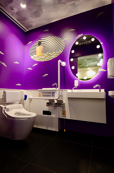 ラフォーレ原宿の3Fの新しいトイレも、同氏の独自の世界観が存分に発揮され、ガーリーかつ独創的なデザインとなった。今回のリニューアルに関して、とんだ林蘭氏は「活気と人々に溢れた原宿の街の中で、このトイレに立ち寄った時、少しの間だけ奇妙でドキドキする異空間となるようなデザインにした」とコメントを残している。