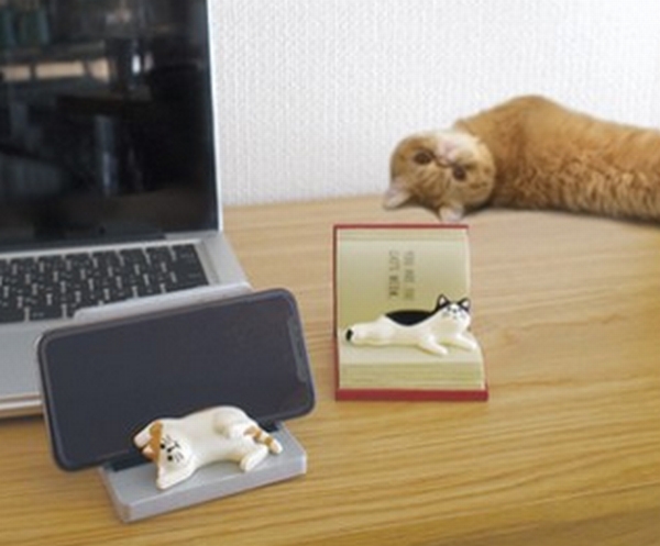 猫は、飼い主にかまってもらいたいのか、お出かけのときや新聞を読んでいる時、ゲームをしている時などに邪魔をしてくるのは有名な話。そこで、そのシーンをそのままスマホスタンドにしたのが本製品。