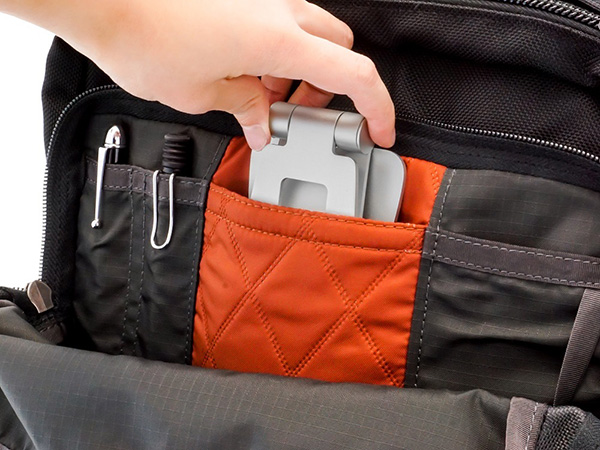 2本の軸(ヒンジ)は自由に動き、好きな角度に調節が可能。貼り付け済みのシリコンラバーに加え、自由に貼れるクッションシートも用意されており、傷防止や滑り止めの役割を果たす。折りたたみ時のサイズは73(幅)×23(高さ)×103(奥行)mm、使用時のサイズは73(幅)×97(高さ)×90(奥行)mmで、重量は約126g。