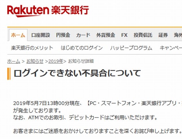 楽天銀行は、2019年5月7日13時現在、パソコン・スマートフォン・楽天銀行アプリ・携帯電話から口座にログインできない不具合が発生していると発表した。