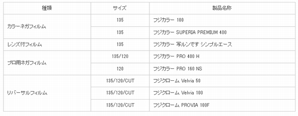 値上げされるのは、カラーネガフィルム、レンズ付フィルム(写ルンです)、プロ用ネガフィルム、リバーサルフィルムの4種類8商品。