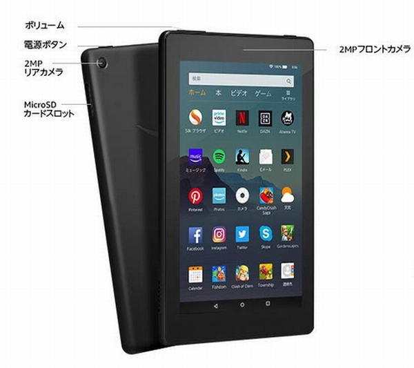 主なスペックは、7インチIPSディスプレイ(1024×600 171ppi)、バッテリーは最大7時間の読書・音楽・TV番組や映画の視聴・Webの閲覧に対応、HD 720pのフロントカメラとリアカメラ搭載、デュアルバンドWi-Fiサポート、ASAP・For You・Prime VideoのダウンロードなどAmazon独自機能の搭載、Amazonのカスタマーサポートを24時間年中無休無料で利用可能。