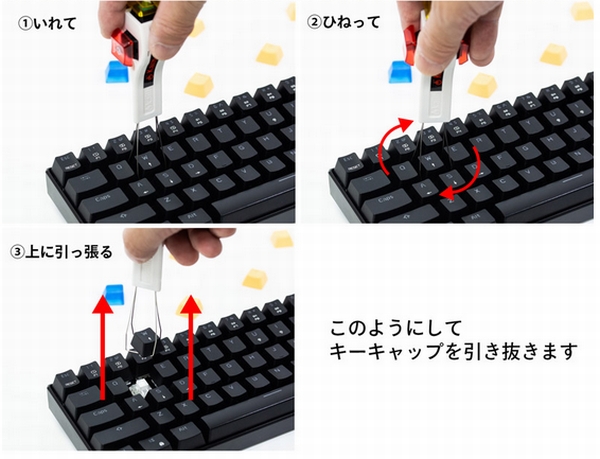 キーキャップを引き抜く時は、本体端のはりがねのような部分をキーボードに差し込んでひねって引っ張るだけでキーキャップが取れる。