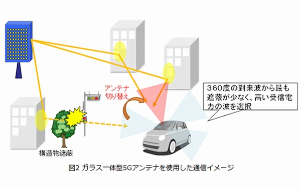 実験では、直進性が強く、車室や建物内で通信するときには電波が弱まってしまう28GHz帯の周波数用に本アンテナを使用。時速約30kmで走行中の実験用車両の窓ガラスにアンテナを貼り付け、車内での5G通信速度を検証した。