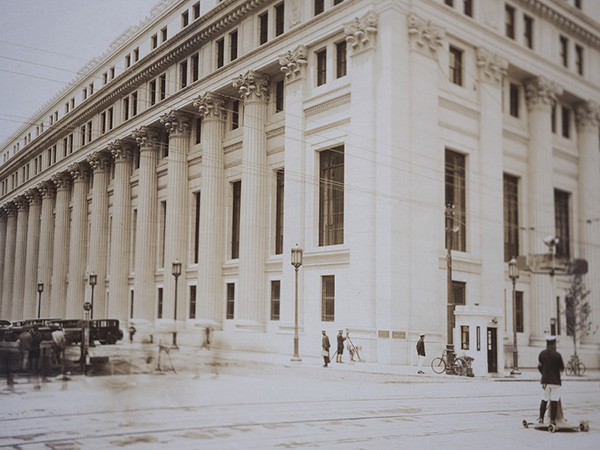 90周年記念の今回のイベントは、合名玄関と呼ばれるオフィスのエントランスと、「三井本館」に隣接する「日本橋三井タワー」の1Fアトリウムで、「三井本館」の歴史を写真や映像によって体験できる無料展示だ。会期中には、「三井本館」の外壁に、ホンマタカシ氏による8.4m四方の巨大な2枚の写真も掲出。これらは「三井本館」の90年前の姿で、当時の過去の写真をホンマ氏の視点で独自に再撮影している。