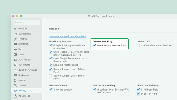 「Vivaldi」の最新バージョンでは、ユーザーのミスリードを誘う広告をブロックする新機能が追加された。たとえば、ポップアップを出してWebサイトから離脱できなくするような悪質な広告を遮断する措置がとられている。不正な広告を遮断する機能はデフォルトで有効になっており、設定の[プライバシー]項目で無効に設定することも可能。ブロックリストは暗号化されたサーバにホストされているが、リストは自動的に更新されるため、毎回サーバに接続する必要はない。