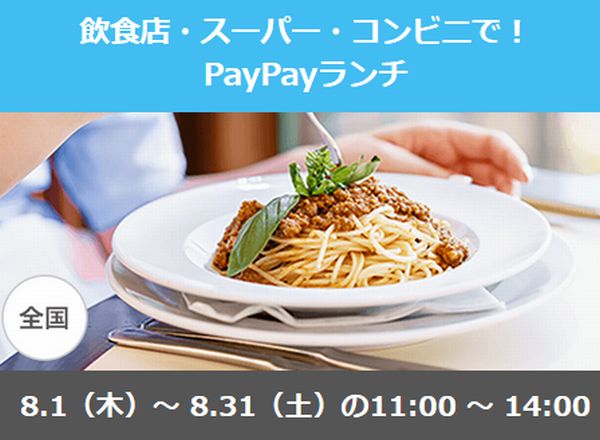 まず、8月1日~31日の8月いっぱい開催されるのは、「飲食店・スーパー・コンビニで!PayPayランチ」。対象の店舗で11~14時に利用すると、PayPayユーザーは最大10%、ソフトバンクスマホ・ワイモバイルスマホユーザー・Yahoo!プレミアム会員は最大20%還元が受けられる。