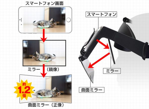 本製品は、動画視聴時にスマホを手で持つ必要がないヘッドマウント。一見、VRゴーグルのように見えるが、本製品はミラーとシアターのような曲面スクリーンを搭載し、スマホの画面より1.2倍サイズの大きさで大画面感を味わうことができる。