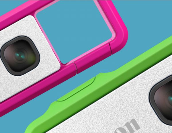 アウトドアで使うアクションカメラとして開発された「Canon IVY REC」。細長いボディの周囲はピンクやグリーンのカラフルなカラビナ風のフレームで囲まれ、持ち運びやすさや耐久性の高さが伺える。